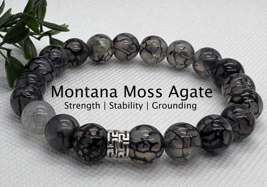 10mm Montana Moss Agate Beaded Stretch Bracelet with a Silver Spacer. Gift for Him. Gift for Her.