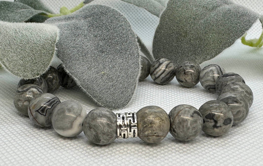 10mm Map Jasper Beaded Stretch Bracelet with a Silver Spacer.