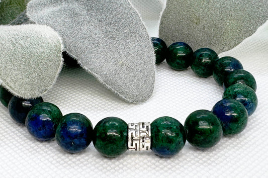 10mm Chrysocolla Azurite Beaded Stretch Bracelet with a Silver Spacer.