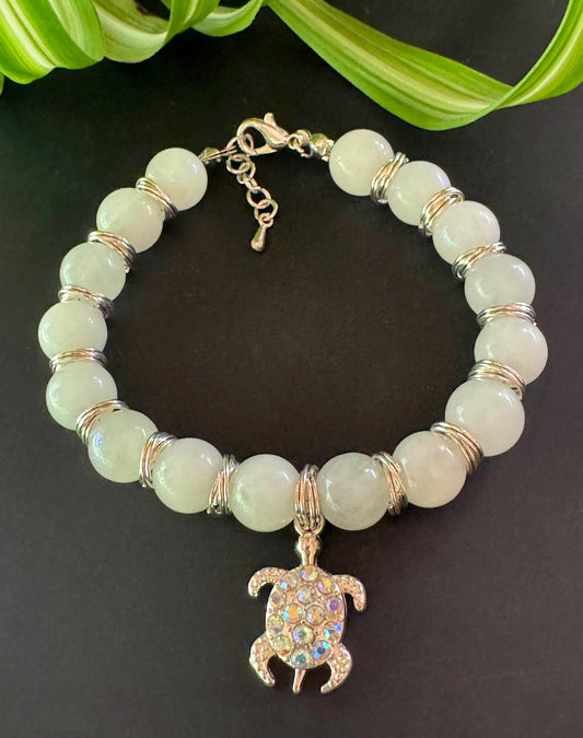 10mm Moonstone Gemstone Bracelet - Moonstone Gemstone bracelet with silver spacers and hanging turtle charm.